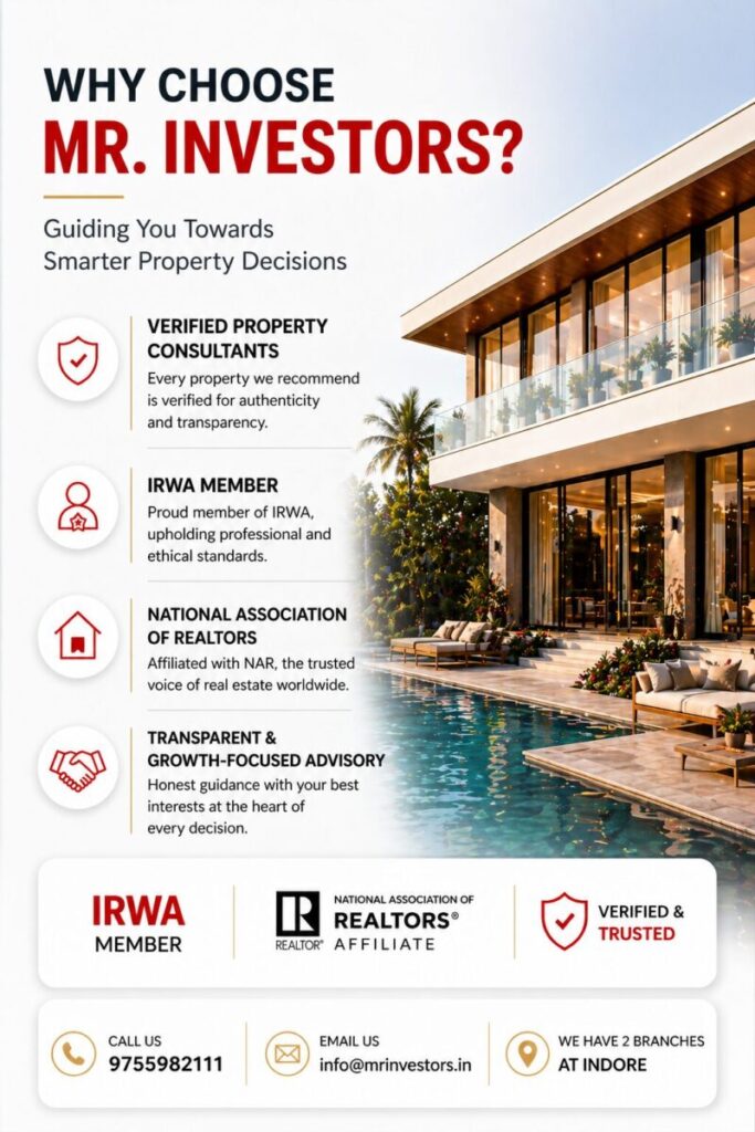Mr.Investors helps clients make confident property decisions that protect wealth and peace of mind. With in -depth understanding of Indore’s real estate market, verified consultants, and a transparent advisory process, we offer clear guidance at every stage. Our approach prioritizes value protection, risk reduction, and long-term growth over short-term transactions. This commitment to integrity and expertise is why families and investors choose Mr.Investors as a real estate agent Indore trusts for dependable advice and sustainable results.